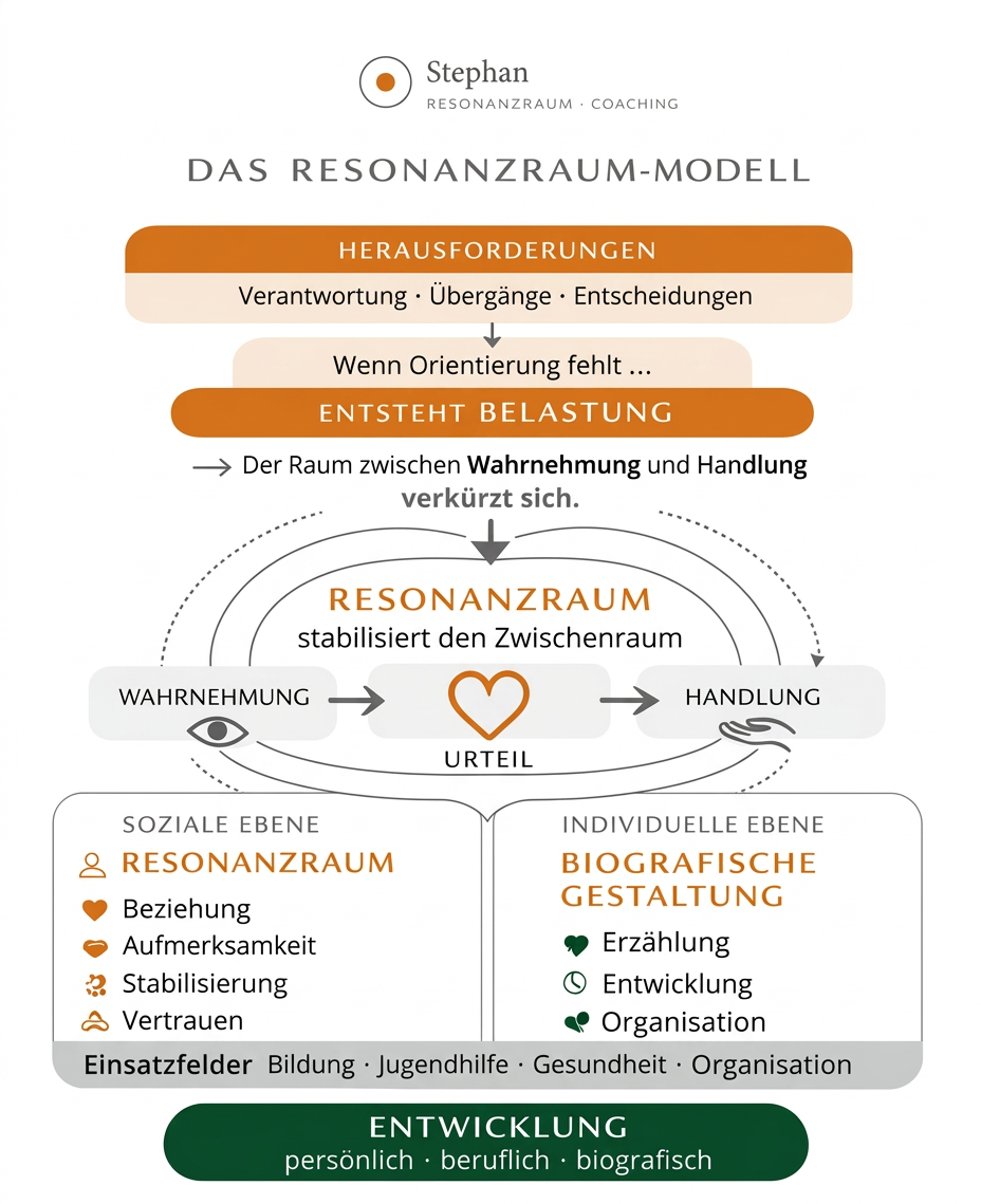 Das Resonanzraum-Modell verbindet soziale Infrastruktur (Resonanzraum) mit individueller Entwicklung (Biografische Gestaltung) zu einem integrierten Ansatz.